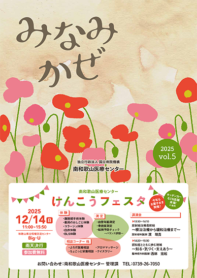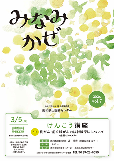 「みなみかぜ」は、南和歌山医療センターが 一般の方々向けに配布している広報誌です。当院が実施してきた取り組みやイベント情報などを幅広く掲載しています。下記にPDFファイルをご用意しました。ご覧になりたい誌面のリンクをクリックして下さい。